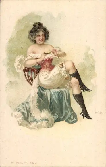 Künstler Litho Frau in Unterwäsche, Zigarette, Strümpfe