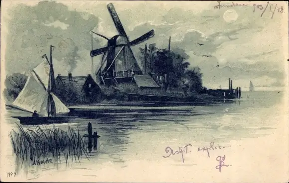 Künstler Litho Heine, Landschaft mit Windmühle und Segelboot