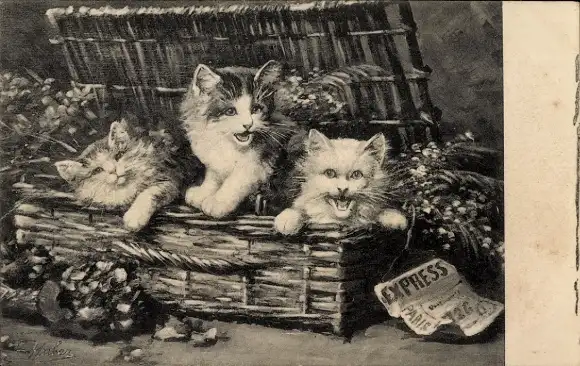 Künstler Litho Huber, E., Junge Katzen in einer Truhe