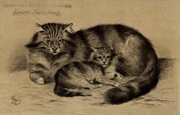 Künstler Litho Katzenmutter, Jungtier, Kätzchen