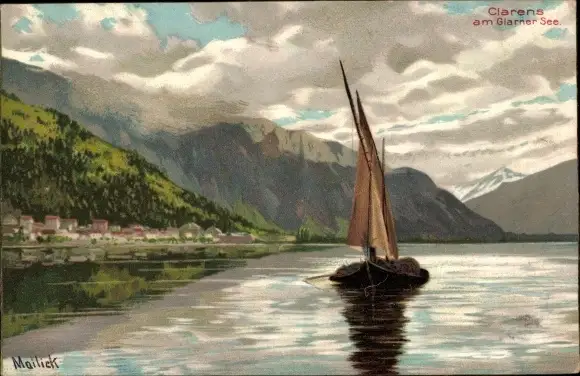 Künstler Litho Mailick, Clarens am Garner See, Segelboot, Ortschaft