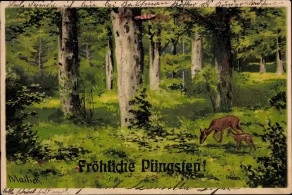 Künstler Litho Mailick, Glückwunsch Pfingsten, Rehe im Wald