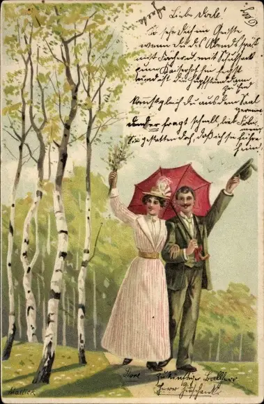 Künstler Litho Mailick, Paar bei einem Spaziergang, Birken