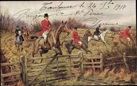Künstler Litho Menschen zu Pferden, Ausritt, Sprung über einen Zaun