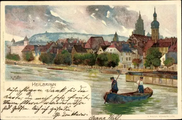 Künstler Litho Mutter, K., Heilbronn am Neckar, Blick auf den Ort, Ruderboot