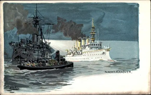 Künstler Litho Schön, C., Nachtmanöver, Kriegsschiffe, Dampfer