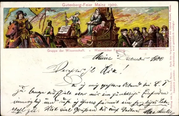 Künstler Litho Sutter, C., Mainz am Rhein, Gruppe der Wissenschaft, Gutenberg-Feier 1900