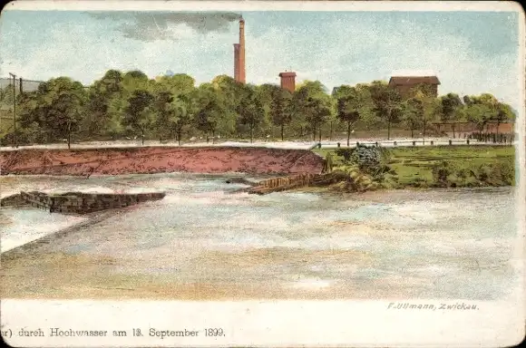 Künstler Litho Ullmann, F., Zwickau, durch Hochwasser zerstörte Brücke, 18. September 1899