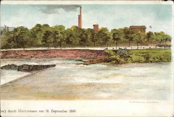 Künstler Litho Ullmann, F., durch Hochwasser zerstörte Brücke, 18. September 1899