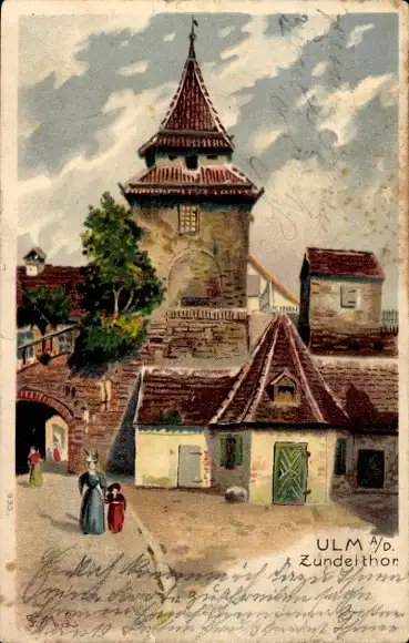 Künstler Litho Ulm an der Donau, Blick auf das Zundelthor