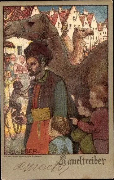 Künstler Litho Weber, H. J., Kameltreiber mit Affe