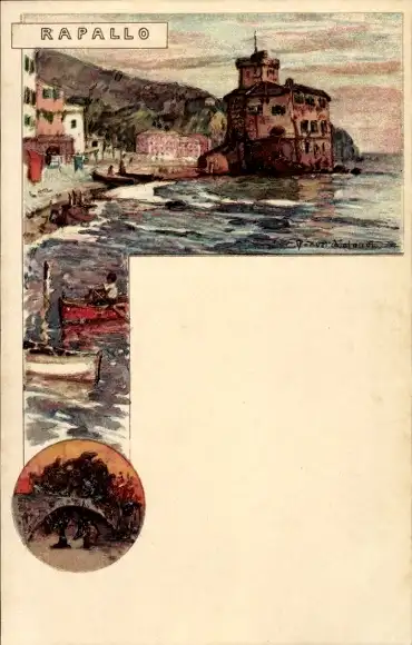 Künstler Litho Wielandt, Manuel, Rapallo Ligurien, Küstenpartie, Boote, Brücke