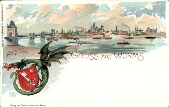 Künstler Litho Worms in Rheinland Pfalz, Stadtpanorama, Wappen, Drache