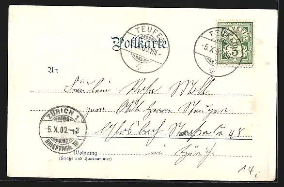 Personenbezogene Daten auf der Rückseite der Karte wurden durch blauen Textmarker unkenntlich gemacht. Die blauen Stellen sind auf die Vorderseite durchgeweicht und wirken sich negativ auf das Postkartenfoto aus