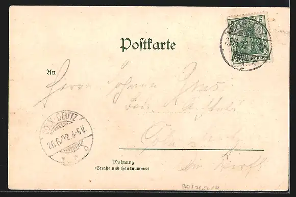 Personenbezogene Daten auf der Rückseite der Karte wurden durch blauen Textmarker unkenntlich gemacht. Die blauen Stellen sind auf die Vorderseite durchgeweicht und wirken sich negativ auf das Postkartenfoto aus