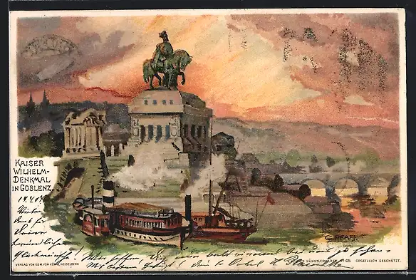 Künstler-Lithographie C. Pfaff: Coblenz, Kaiser Wilhelm-Denkmal
