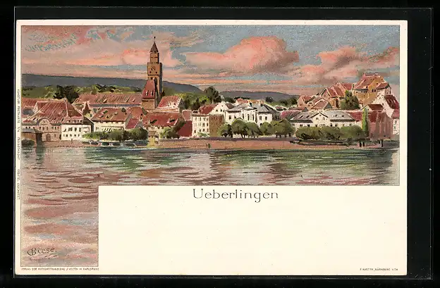 Künstler-Lithographie Carl Biese: Ueberlingen / Bodensee, Totalansicht des Ortes