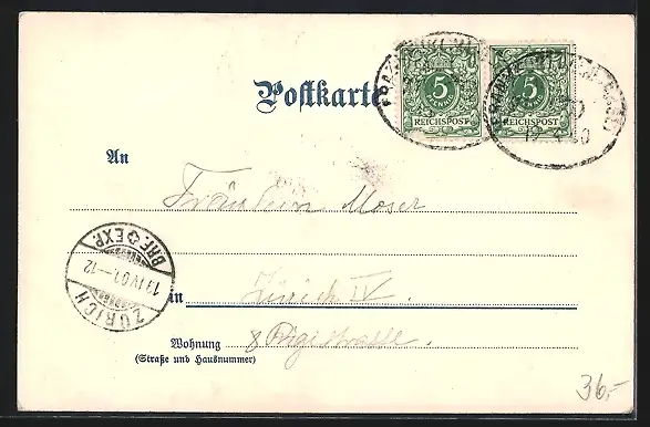 Personenbezogene Daten auf der Rückseite der Karte wurden durch blauen Textmarker unkenntlich gemacht. Die blauen Stellen sind auf die Vorderseite durchgeweicht und wirken sich negativ auf das Postkartenfoto aus