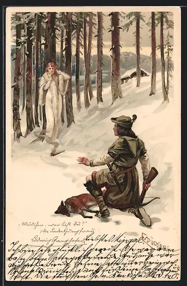 Künstler-Lithographie E. Döcker: Jäger und weisse Dame