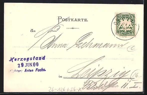 Personenbezogene Daten auf der Rückseite der Karte wurden durch blauen Textmarker unkenntlich gemacht. Die blauen Stellen sind auf die Vorderseite durchgeweicht und wirken sich negativ auf das Postkartenfoto aus