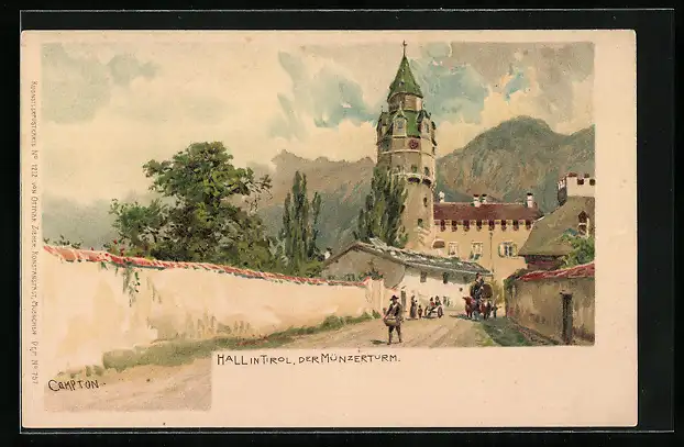 Künstler-Lithographie Edward Theodore Compton: Hall in Tirol, Münzerturm
