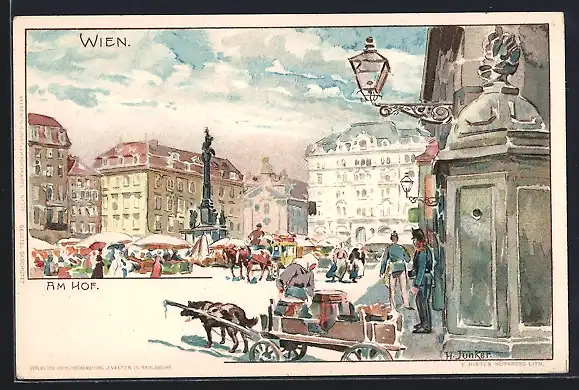 Künstler-Lithographie H. Junker: Wien, Am Hof, Marktstände, Hundegespann