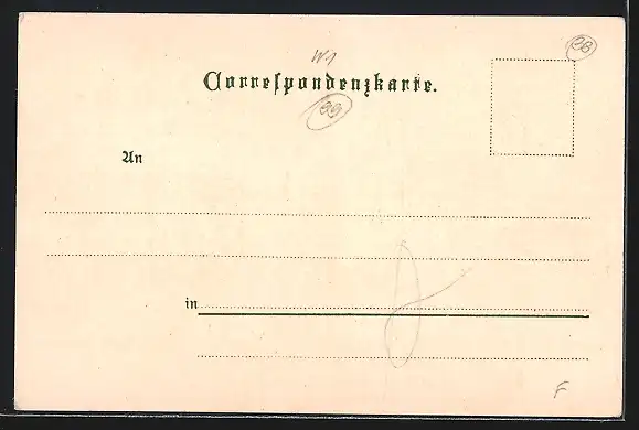 Personenbezogene Daten auf der Rückseite der Karte wurden durch blauen Textmarker unkenntlich gemacht. Die blauen Stellen sind auf die Vorderseite durchgeweicht und wirken sich negativ auf das Postkartenfoto aus