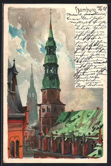 Künstler-Lithographie Heinrich Kley: Hamburg, Kirchmotiv
