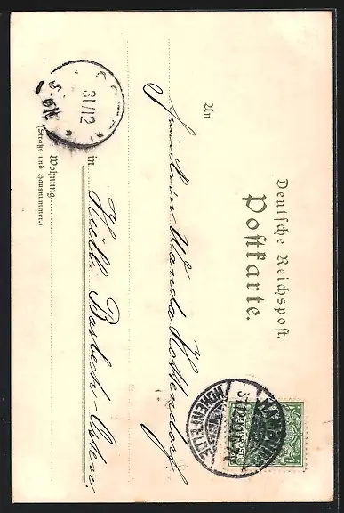 Personenbezogene Daten auf der Rückseite der Karte wurden durch blauen Textmarker unkenntlich gemacht. Die blauen Stellen sind auf die Vorderseite durchgeweicht und wirken sich negativ auf das Postkartenfoto aus
