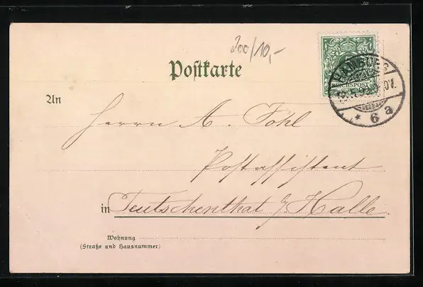 Personenbezogene Daten auf der Rückseite der Karte wurden durch blauen Textmarker unkenntlich gemacht. Die blauen Stellen sind auf die Vorderseite durchgeweicht und wirken sich negativ auf das Postkartenfoto aus