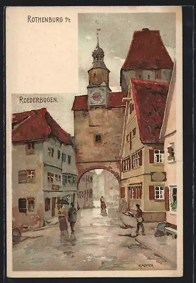 Künstler-Lithographie Karl Mutter: Rothenburg, Strassenpartie mit Roederbogen