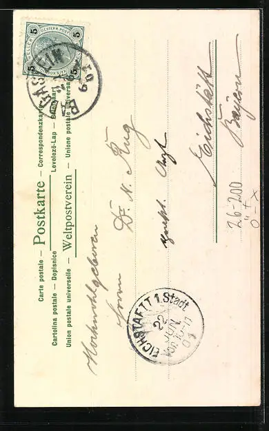 Personenbezogene Daten auf der Rückseite der Karte wurden durch blauen Textmarker unkenntlich gemacht. Die blauen Stellen sind auf die Vorderseite durchgeweicht und wirken sich negativ auf das Postkartenfoto aus