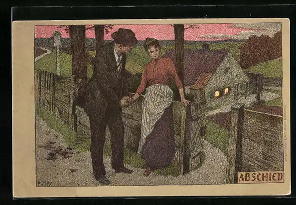 Künstler-Lithographie Paul Hey: Abschied eines Paares in der Dämmerung