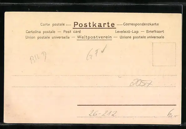 Personenbezogene Daten auf der Rückseite der Karte wurden durch blauen Textmarker unkenntlich gemacht. Die blauen Stellen sind auf die Vorderseite durchgeweicht und wirken sich negativ auf das Postkartenfoto aus