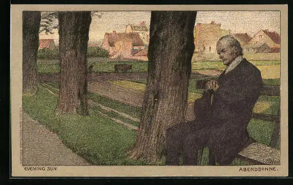 Künstler-Lithographie Paul Hey: Ein Herr sitzt in der Abendsonne