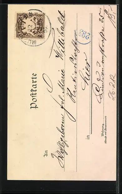 Personenbezogene Daten auf der Rückseite der Karte wurden durch blauen Textmarker unkenntlich gemacht. Die blauen Stellen sind auf die Vorderseite durchgeweicht und wirken sich negativ auf das Postkartenfoto aus