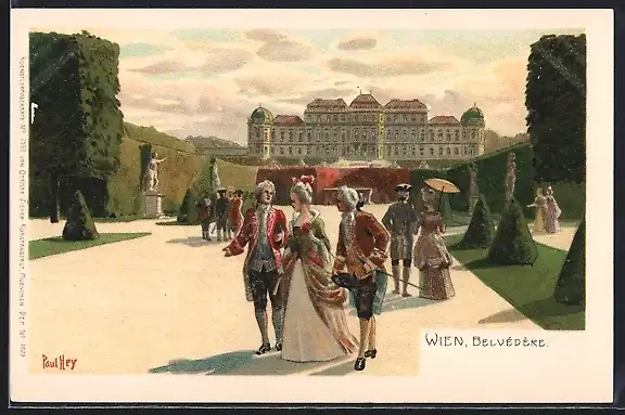 Künstler-Lithographie Paul Hey: Wien, Belvedere, Höfisches Leben