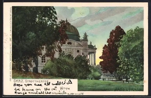 Künstler-Lithographie Raoul Frank: Graz, Partie am Stadttheater