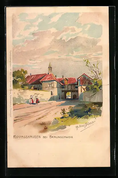 Künstler-Lithographie Zeno Diemer: Riddagshausen, Ortsansicht