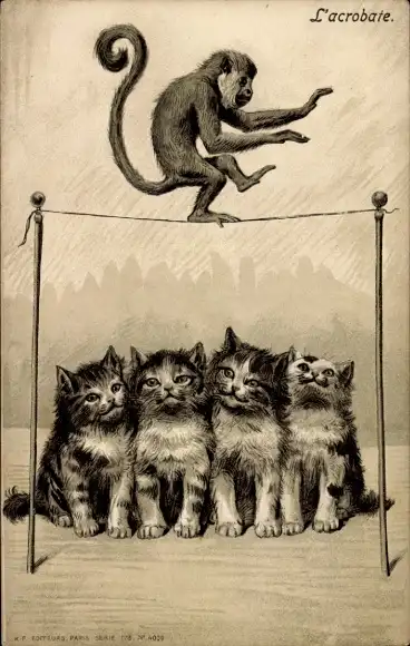 Künstler Präge Ak Katzen, Affe balanciert auf Seil