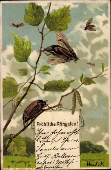 Künstler Präge Litho Glückwunsch Pfingsten, Maikäfer, Haselzweig