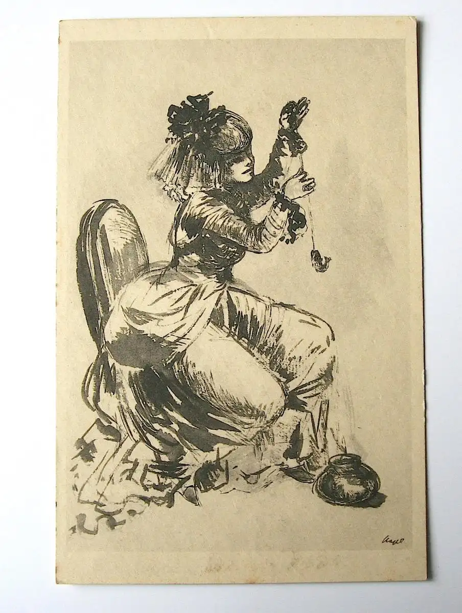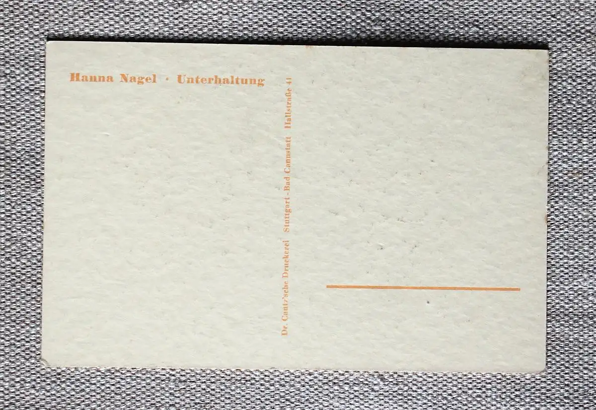 Motiv: Sitzende Frau, die einen Goldfisch aus einem Glas angelt. Künstler: Hanna Nagel. Verlagsangaben: Stuttgart-Bad Cannstatt, Dr. Cantz‘sche Druckerei, 1950 ?.