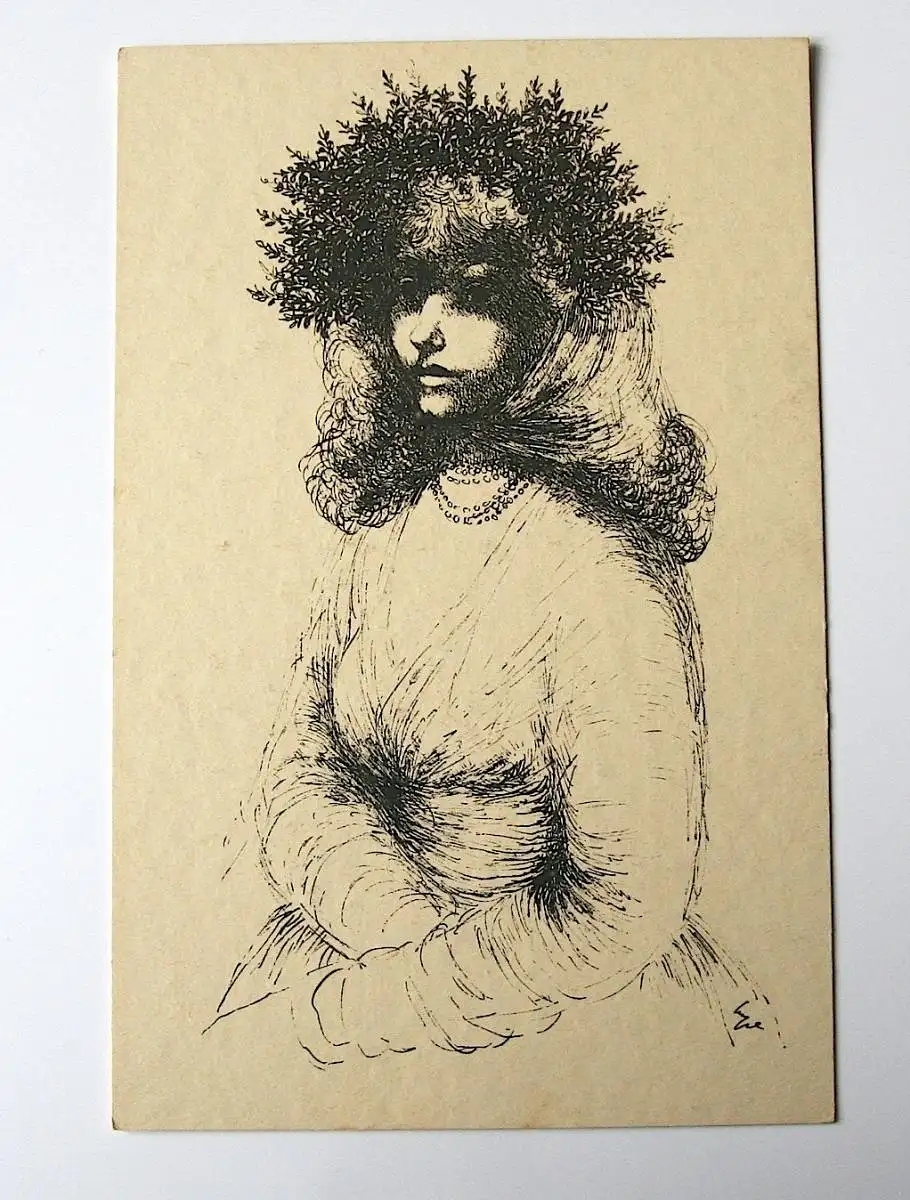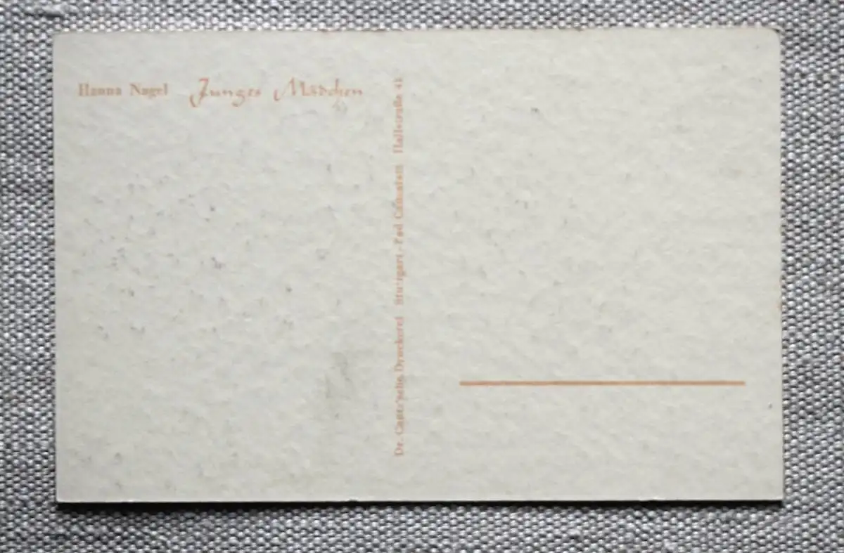 Motiv: Zeichnung eines Mädchens mit Kopfhaube aus Zweigen. Künstler: Hanna Nagel. Verlagsangaben: Stuttgart-Bad Cannstatt, Dr. Cantz‘sche Druckerei, 1950er ?.