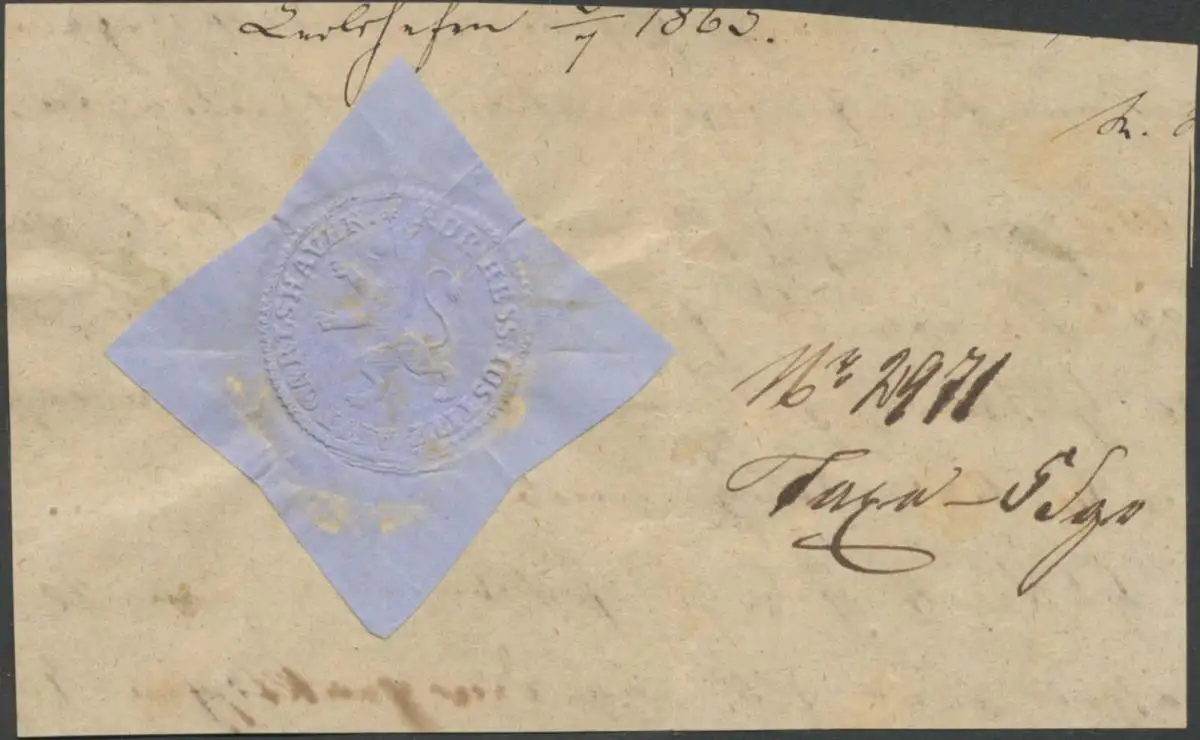 blau, geprägt, Größe/Zustand: 6x6 , aufgeklebt auf Briefauschnitt, beschädigt, Original Verschluss-Siegelmarke aus Papier welche früher von Behörden, Firmen etc. zum Versiegeln der Briefe benutzt wurden