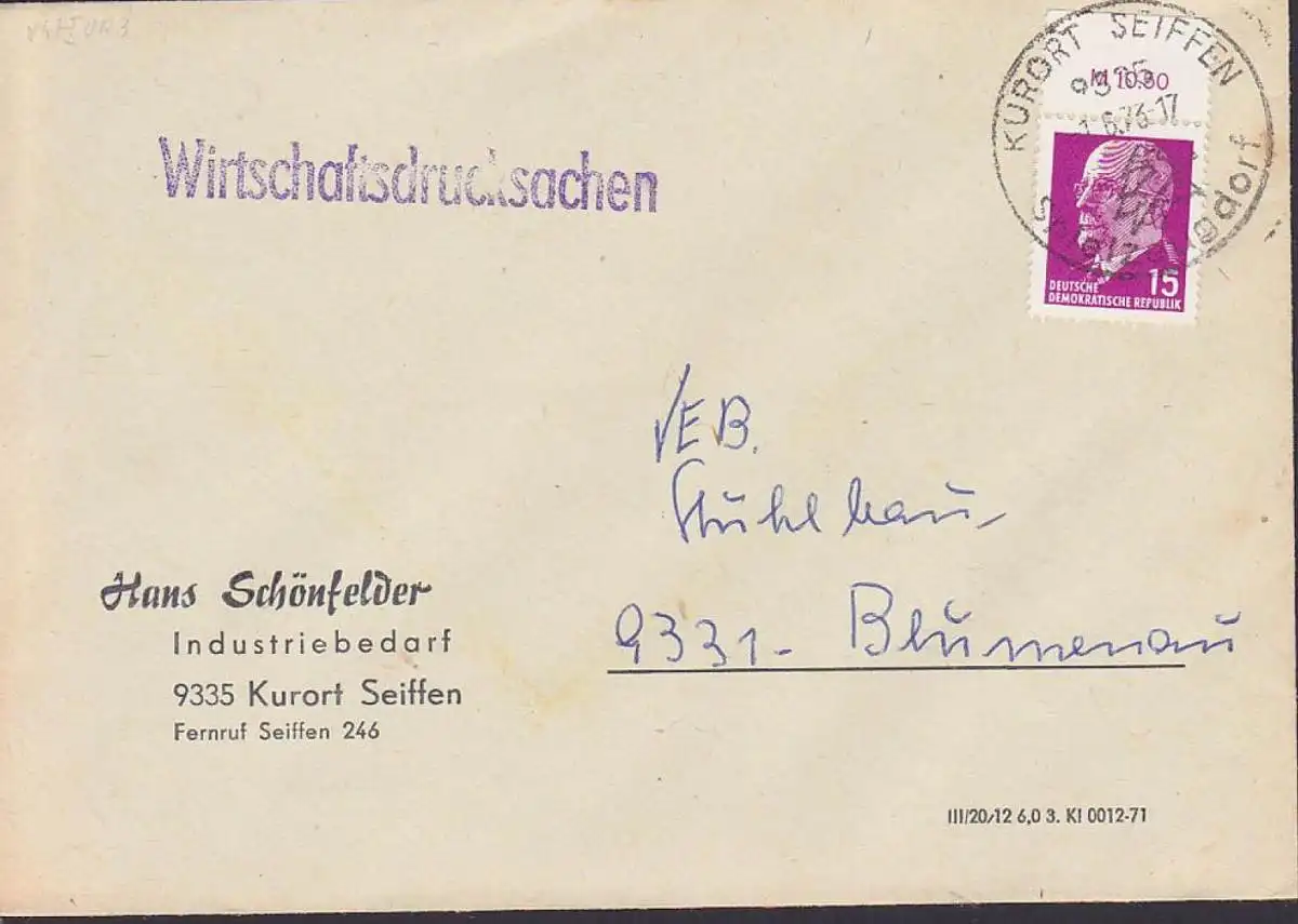 Kurort Seiffen W.-Ducksache mit 15 Pfg. Walter Ulbricht Oberrand 847 OR3 1.6.73