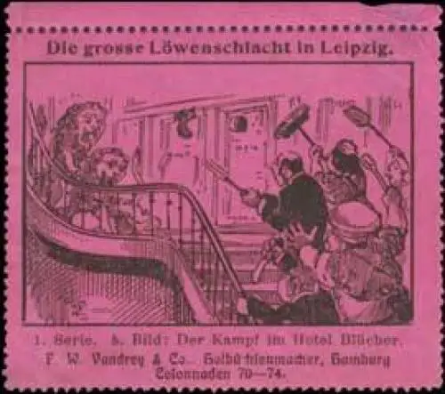 Die grosse Löwenschlacht in Leipzig, 1. Serie 5. Bild: Der Kampf im Hotel Blücher. , Größe/Zustand: 5x7 , guter Zustand, Original alte Reklamemarke die seinerzeit für die Werbung benutzt wurde