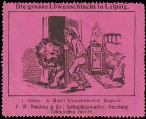 Die grosse Löwenschlacht in Leipzig, 1. Serie 6. Bild: Unheimlicher Besuch. , Größe/Zustand: 5x7 , guter Zustand, Original alte Reklamemarke die seinerzeit für die Werbung benutzt wurde