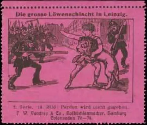 Die grosse Löwenschlacht in Leipzig, 2. Serie 13. Bild: Pardon wird nicht gegeben. , Größe/Zustand: 5x7 , guter Zustand, Original alte Reklamemarke die seinerzeit für die Werbung benutzt wurde