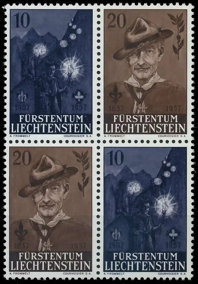 10 Rp. + 20 Rp. Wert der Ausgabe 50 Jahre Pfadfinderbewegung im 4er Block (MichelNr.: 360, 361)