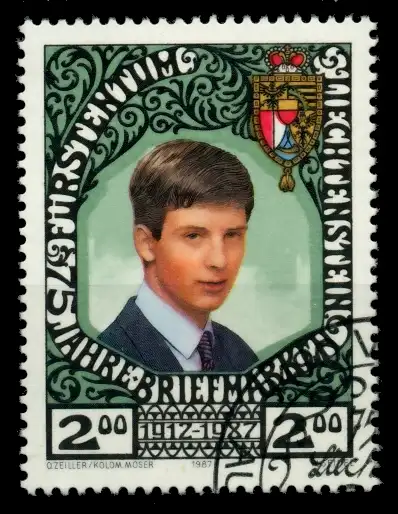 75 Jahre Briefmarken von Liechtenstein, mit Versandstellenstempel in irgend einer Ecke